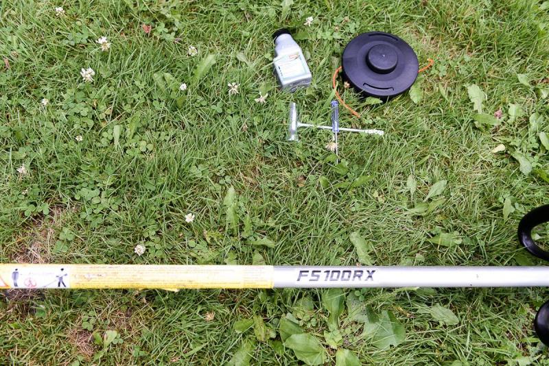 The Stihl FS 100 RX is a professional-grade grass / brush trimmer featuring a 31.4 cc engine, a 16.5-inch cutting width string grass head, and a 1.4 bhp output. It weighs 10.8 lbs and has a fuel capacity of 18 ounces. The loop handle (R) provides support and control.