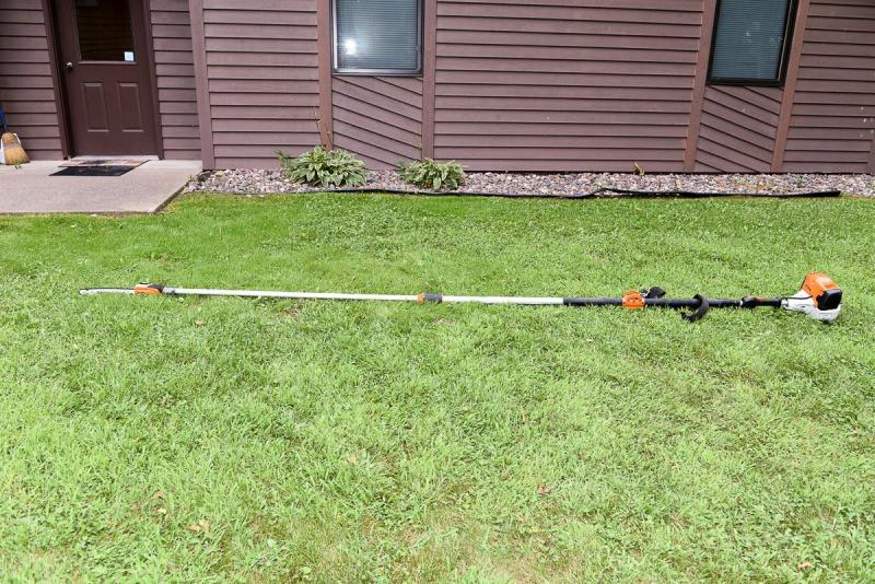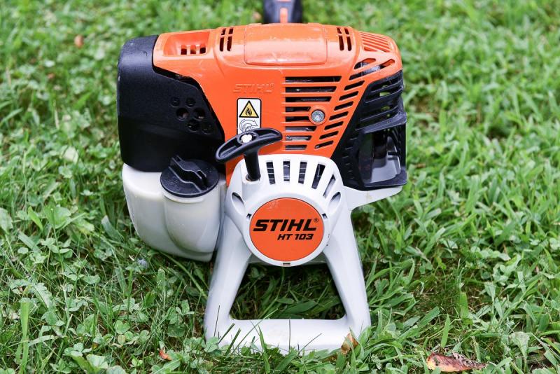 From Stihl: The STIHL HT 103 is a gas-powered, telescoping pole pruner with a 31.4 cc engine. It features a 12-inch bar and chain, and its overall length can be adjusted from 7.5 to 11.5 feet. The pruner weighs 15.5 lbs (with the cutting attachment).